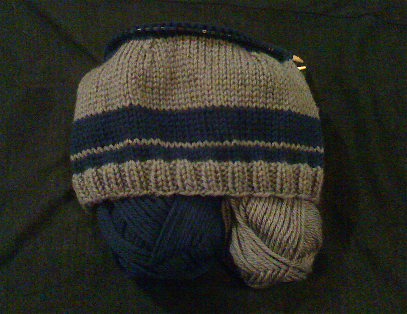 Lastly, I am knitting an R2D2 hat for my friend Josh. Right now it is just a striped hat, but it will become R2 by the magic of duplicate stitching. I had originally started making it using stranded knitting but it just wasn’t working out. My strands weren’t long enough to accommodate the amount of stretch when wearing. So this is really R2-2.0:
