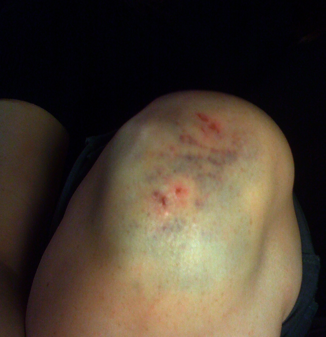 A week ago today we started out the morning with a few bloody marys. There is a dog-friendly place around the corner that has a great DIY bloody mary bar as well as fun board games, so we all decided to stop in for a stretch. I had my first experience playing Apples to Apples, and I highly recommend it. After we had our fill of vodka drinks, we headed home for a bit to enjoy the rest of our day. I took Henry by the leash and decided to take him for a bit of a run. We sped off and then circled back to the group. Henry decided to circle right in front of me and the leash tripped me. Joey and Aaron had been standing outside wondering what the heck I was doing, so they got to see the whole thing as it happened: my right knee took the brunt of the fall, then I fell onto my right side and slid a few feet while Henry was still running. I just lay there on the cement for a minute and listened to Joey and Aaron freaking out about what had just happened. They ran over to me and helped me up and I just bent over in a large amount of pain, but also laughing really hard cause I knew how silly it had looked. I ended up with road rash on my hip and my shoulder, a bruise on my left ankle, right elbow and right knee. The knee bruise was the worst. I was limping for two days and it is still tender to the touch a week later: