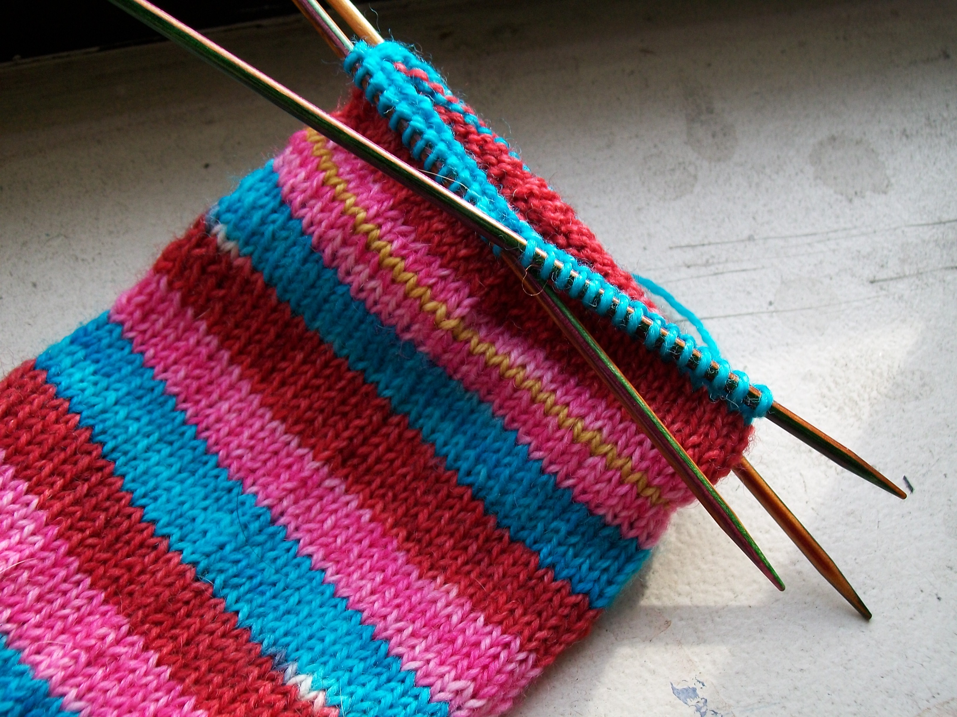 The afterthought heel is super easy- when you get to the point where you want to start the heel, you knit half the stitches on one round with waste yarn (the yellow line of stitches in the pic above). Then, after you’ve finished the leg, you remove the waste yarn and put the live stitches back on your needles and knit the heel. (I just decrease like you would for a toe, and it comes out pretty well.)
