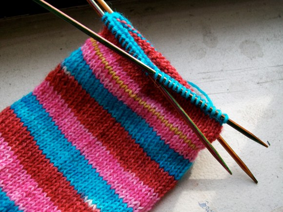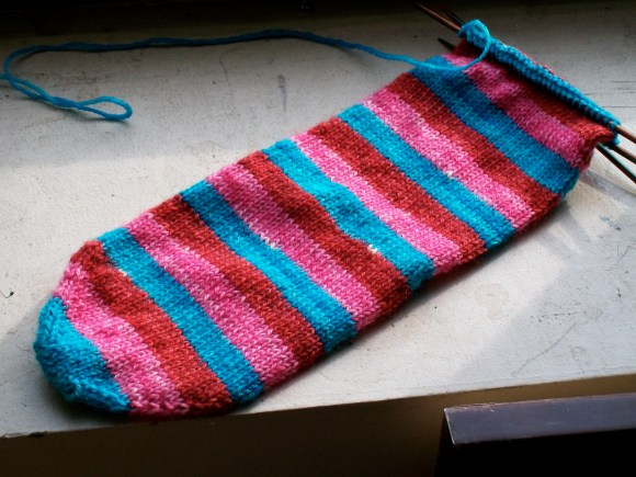 The yarn is Vesper Sock, and I’ve had it for quite a while. I probably bought it back in my yarn-binging days of 2007. I’ve knitted socks with this yarn before (a pair for Joey- blue, red and brown stripes) and now its my turn to get a pair of stripy socks. I’ll be doing an afterthought heel on this pair as well, which I think is the best way to do a heel with self-striping yarn.