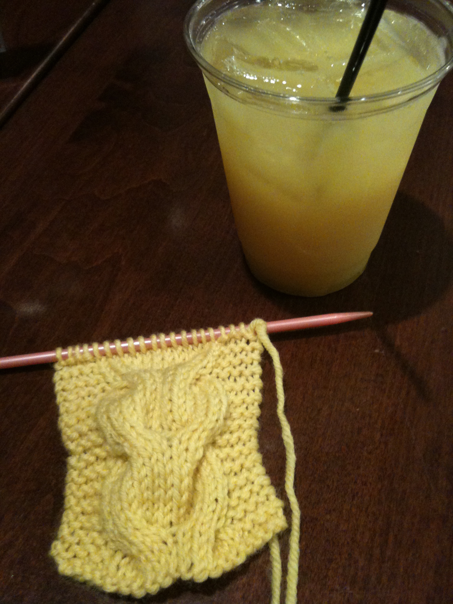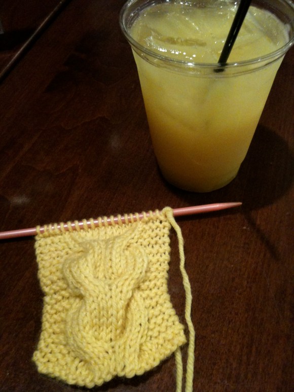 Progress on the cardigan was put on hold shortly after joining the sleeves to the body.  Not because I’ve lost interest, but because I was doing some travelling and a ginormous cardigan and sleeves on one needle is just a little too unruly for plane knitting.  I had a request for a wee coffee cup insulator by my sister in law, so I knitted that on the way down to Texas.