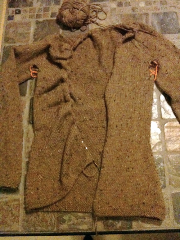 Fall is in the air in NYC today- crisp weather that just begs for a hand-knit cardigan.  Unfortunately, my cardigan has been languishing around looking like this for over two weeks now: