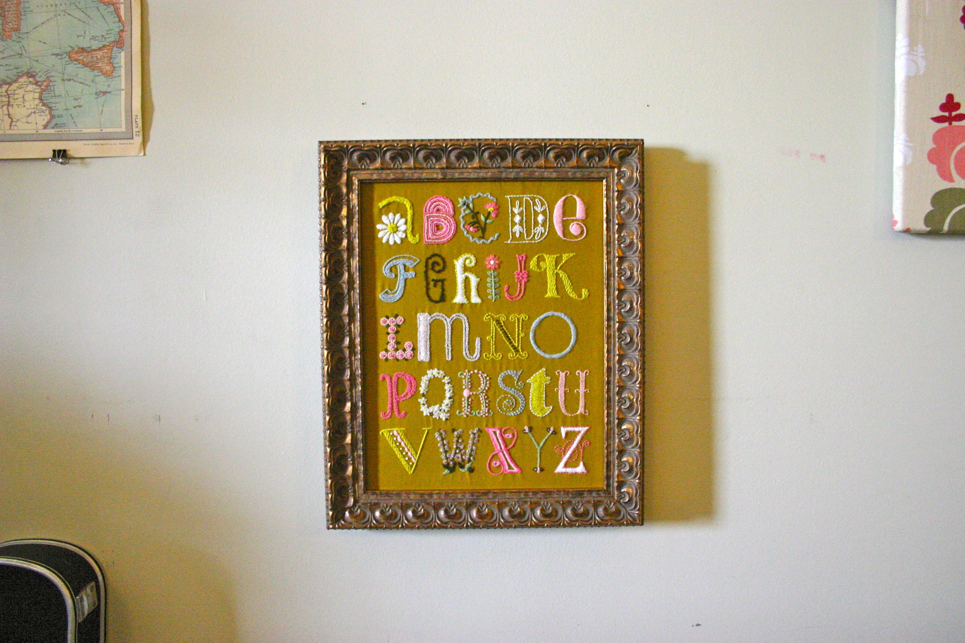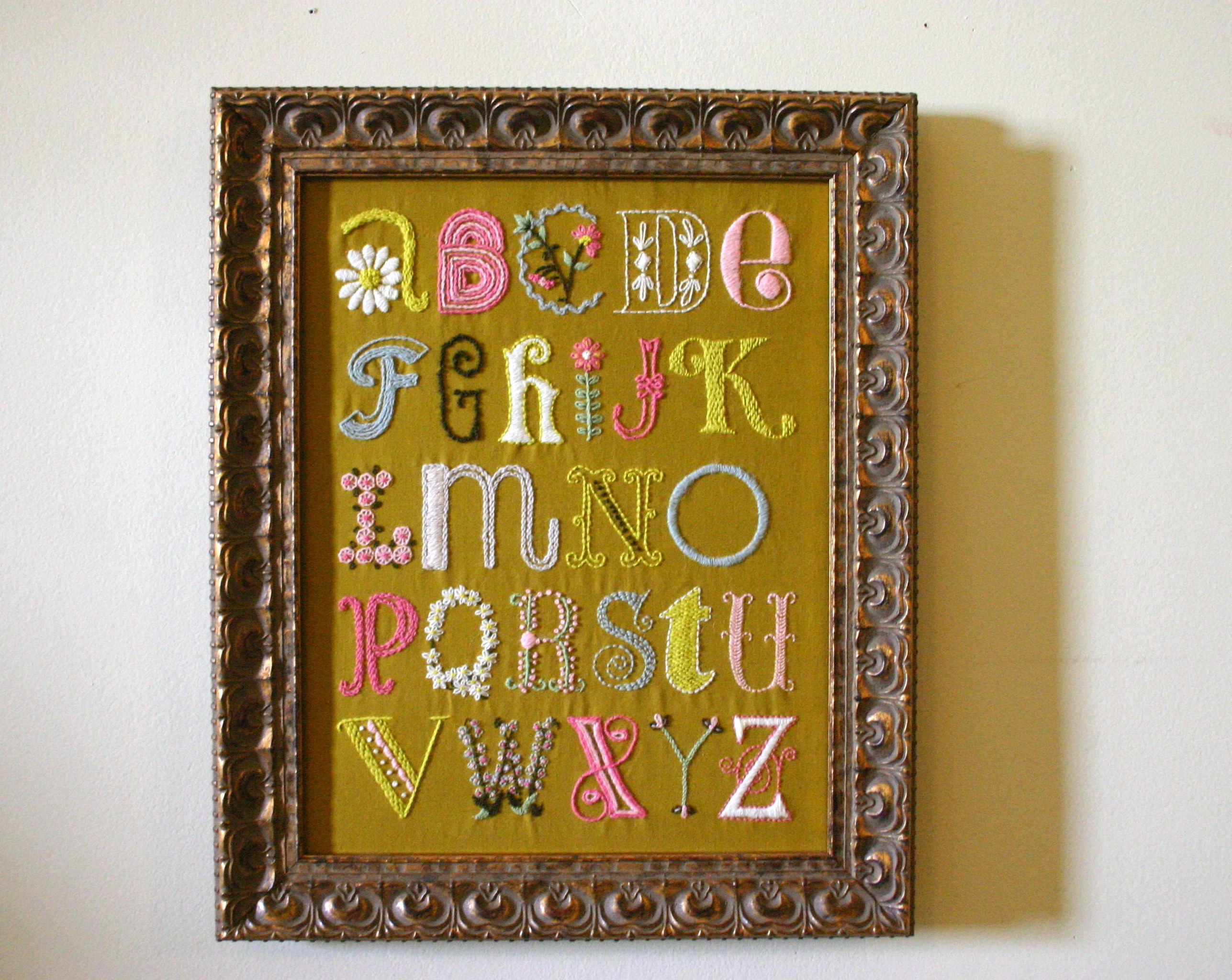 The Daisychain ABC Sampler is finished. I had so much making this, that when I was midway through working on it I kept envisioning all the other things in the apartment I could be putting tiny little crewel-work flowers on. Poor Joey is going to wake up one day with little daisies all over his pillowcase and not know what happened.