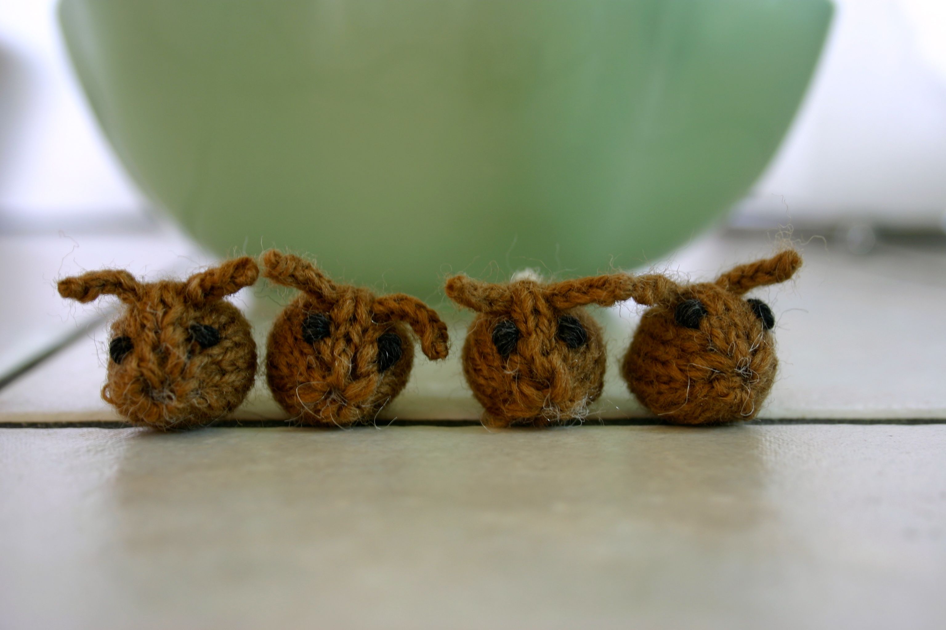 Bunny-watching, it seems, is pretty hard work when it comes to capturing and sharing these sweet little moments with others. I tried so hard to take a video to send to Joey when he was in Sweden a few weeks ago. Two buns were just chasing each other in circles around our back yard for almost an hour. Unfortunately, I couldn’t get close enough to capture the cuteness. And wouldn’t you know, even knitted bunnies are hard to snap shots of. I was only able to get two quick pics before these little buns hopped off a new home with my niece and nephews.