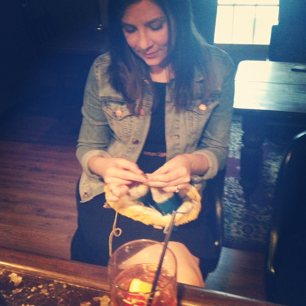 I am working on a sort-of secret knitting project right now; a gift for someone I love.   I realized yesterday that my deadline for finishing this gift is closer than I thought, so I’ve taken to working on it anywhere and everywhere.  Last night I even worked on it at the bar during happy hour.   A classic cocktail in one hand and my knitting in the other- it wasn’t a bad way to spend the evening!