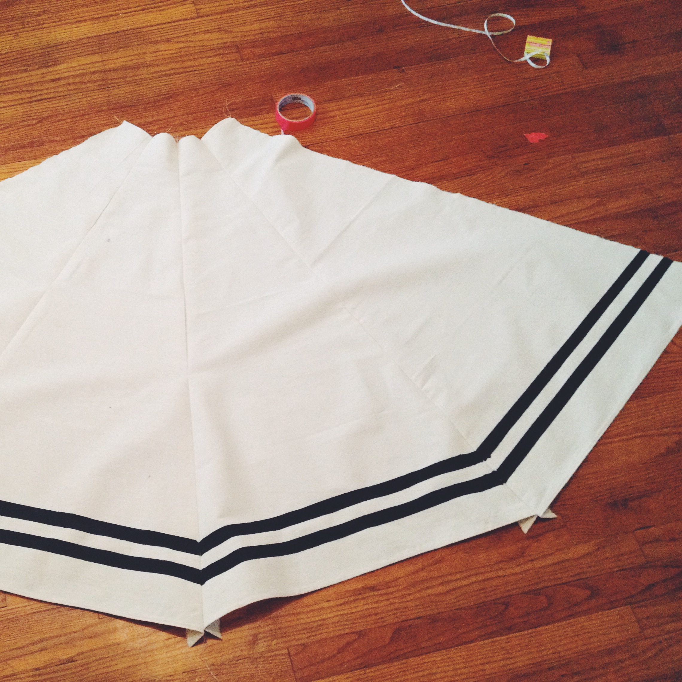 I just decided to wing it on the construction- I grabbed a few 38” long dowels, some jute twine and a canvas drop cloth at the hardware store. The hardest part was figuring out how to do the cover. I didn’t want to just drape the fabric over the frame so I decided to bring out the sewing machine and sew a bunch of triangles together. I also decided to paint some black stripes along the bottom and stitch on a few reinforcements above the slit for the opening.