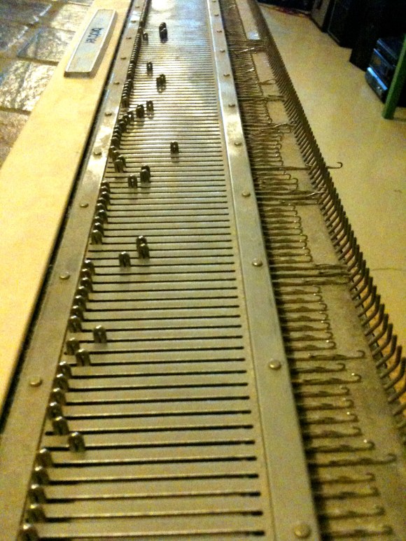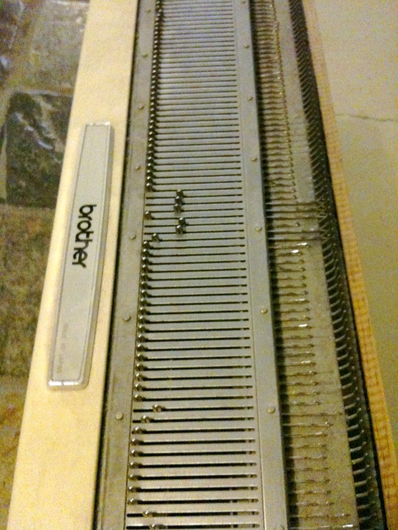 I knew that my needles weren’t long enough to pick up stitches all the way up one side, across the back neckline, and back down the other side. So I put it aside and considered my options. I considered buying the little metal connector piece that KnitPicks sells to combine two cables and create a long cable, but then I didn’t want to pay shipping for something that only costs $1.99. Of course, I could always buy some more yarn…. but I am really trying to not buy yarn unless I have a specific project in mind. I considered dropping by a couple of yarn shops to pick up a long circular needle, but again, talked myself out of buying another pair of needles that I don’t really need. So I started picking up stitches one night just to see how crowded it would get. Well, you can see where I stopped. The cardigan has since lay dormant while I await my KnitPicks order (yes, I finally decided that the connector was still the least expensive way to go.)