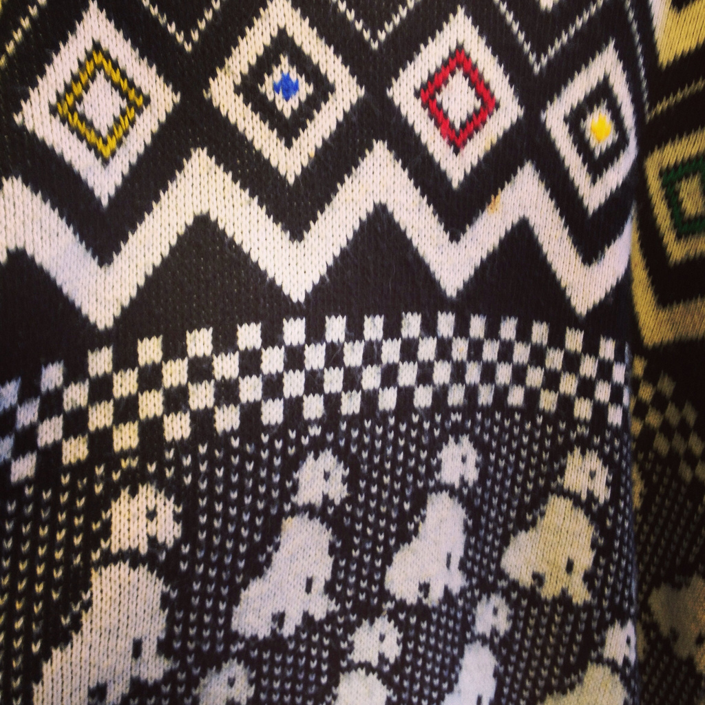 This sweater caught my eye because of the bold graphic diamond and zig zag patterning.  I’m not so sure about what the checkered finish  line and puppy dogs have to do with anything, but there they are.  This one was rightly tagged as a “fun Cosby sweater.”