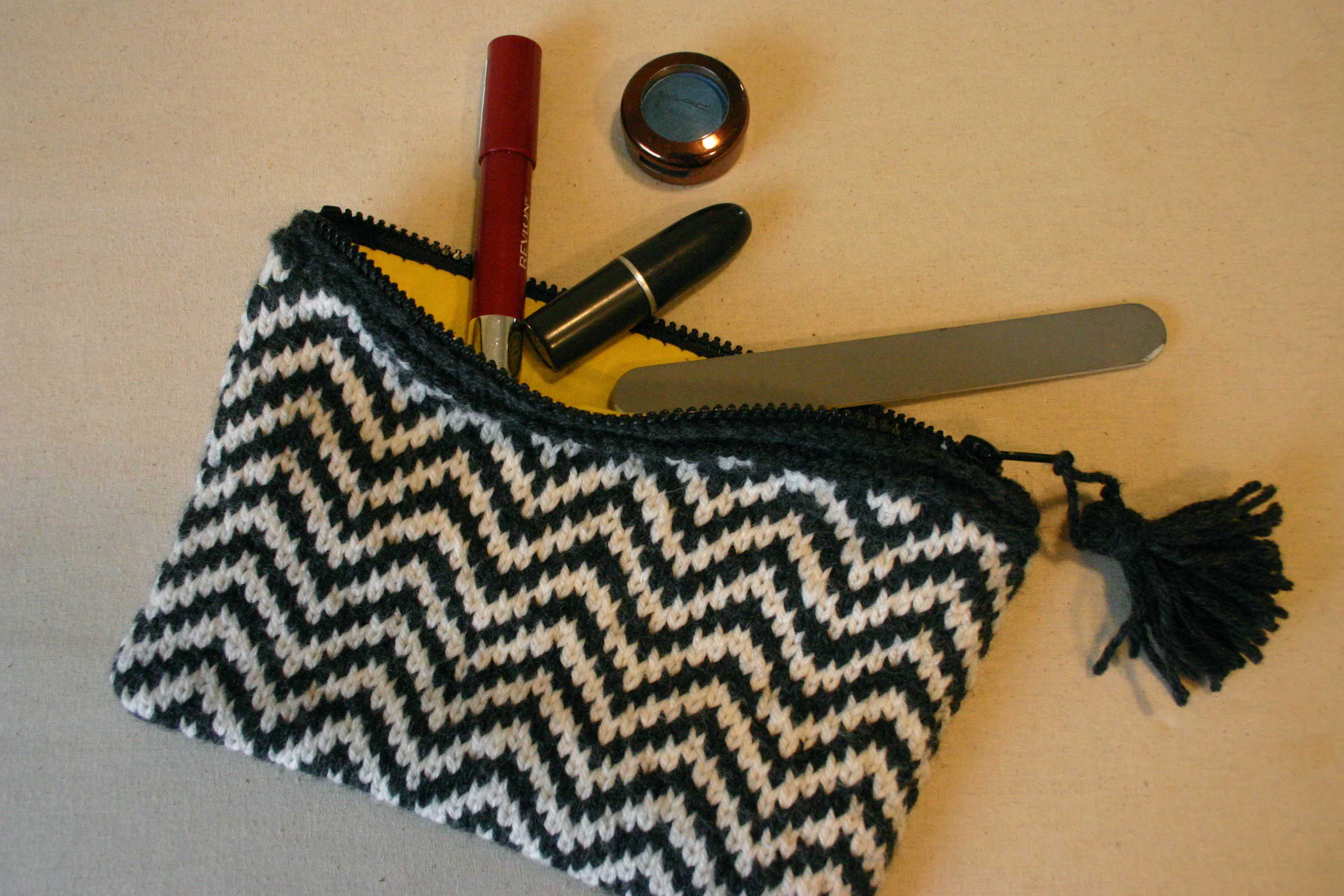 A perfect accessory for Spring, the Zip-N-Zag Bag is a zippery, zig-zaggy, tassely pouch perfect for stashing your makeup or a small knitting project on the go. Pattern is available as an instant download via Ravelry for $5.00. For personal use only. Copyright 2013, Kim McClellan