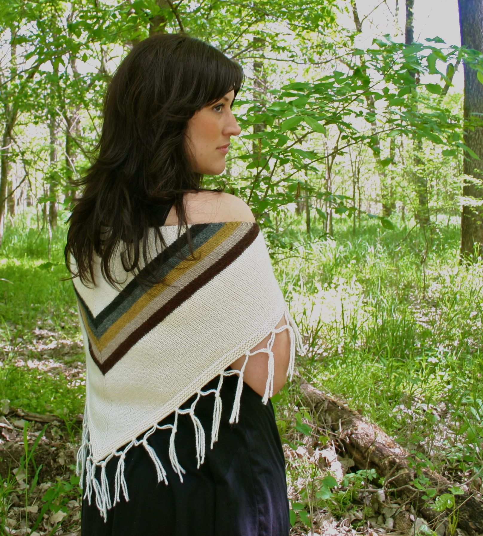 Wood, Stone, Straw & Bone is worked flat from the top center out, increasing each right side row to gradually form a triangular shape. The size of the shawl can be easily adjusted by working more or less rows of the main color sections. Pattern is available as an instant download via Ravelry for $5.00. For personal use only. Copyright 2013, Kim McClellan